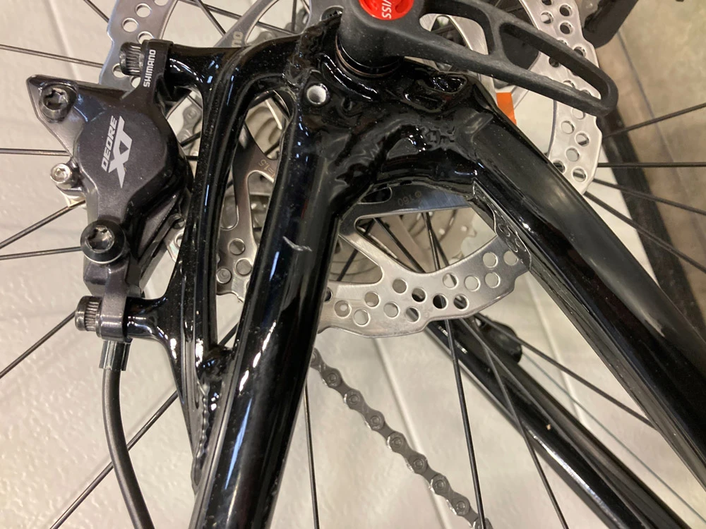 Bei diesem Scart Light 10.0 von Radon handelt es sich um einen Rückläufer. Das Crossbike weist leichte optische Mängel auf, die keinerlei Einfluss auf die Funktion haben und in den Abbildungen 2 (Lackschaden links an der Sitzstrebe) und 3 (Lackschaden am Oberrohr) wiedergegeben sind.